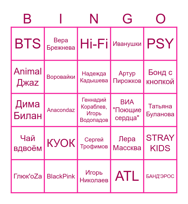 This bingo card has 25 words: КУОК, Игорь Николаев, Надежда Кадышева, Глюк'оZа, PSY, BTS, Animal Джаz, Вера Брежнева, ВИА "Поющие сердца", Сергей Трофимов, Артур Пирожков, Дима Билан, Лера Массква, STRAY KIDS, Воровайки, БАНД'ЭРОС, Татьяна Буланова, Hi-Fi, Бонд с кнопкой, Anacondaz, Геннадий Кораблев, Игорь Водопадов, BlackPink, Чай вдвоём, Иванушки and ATL.