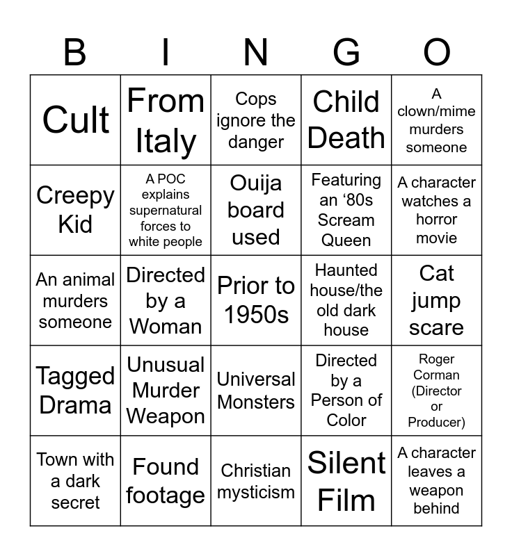 This bingo card has 78 words: American Remake of International Horror Film, POC dies first, Cops ignore the danger, "I'll be right back", Car won't start, The ending teases a sequel, A harbinger of doom warns the protagonist, Library scene, Killer’s backstory exposition dump, Nudity, Dog Death, Cat Death, Child Death, Cult, Bad Scientific Explanation, Creepy Kid, Final girl, Unusual Murder Weapon, Haunted Technology, Cat jump scare, “Based on a True Story”, A clown/mime murders someone, An animal murders someone, Ouija board used, A POC explains supernatural forces to white people, A Lovecraft Story, Sudden change in weather, Someone investigates a strange noise, An escape room type situation with torture, Toxic Waste/Ooze/Sludge/Slime, A character watches a horror movie, A himbo ignoring warning signs, Christian mysticism, A character leaves a weapon behind, Town with a dark secret, Haunted house/the old dark house, A character named after another horror character/director, The killer has mommy issues, Big, obviously fake bat, Prior to 1950s, The 2010s, 4th or Later in Franchise, From Japan, From Australia, From South Korea, From Italy, From France, From South America, Wes Craven Directed, John Carpenter Directed, Roger Corman (Director or Producer), Directed by a Woman, Directed by a Person of Color, From Ireland, From Indonesia, From Hong Kong, From George A. Romero, From Clive Barker (writing, directing, producing), Chrisopher Lee or Vincent Price, Universal Monsters, Featuring an ‘80s Scream Queen, Slasher, Tagged Romance, Tagged Comedy, Blumhouse or A24, From Sam Raimi, Tagged Sci-fi, From Amicus or Hammer Studios, Tagged Drama, Found footage, Tagged Music, Queer filmmaker, Stephen King adaptation, Video Nasties, Silent Film, Shudder or Tubi, Boris Karloff or Bela Lugosi and Remake of an American horror film.