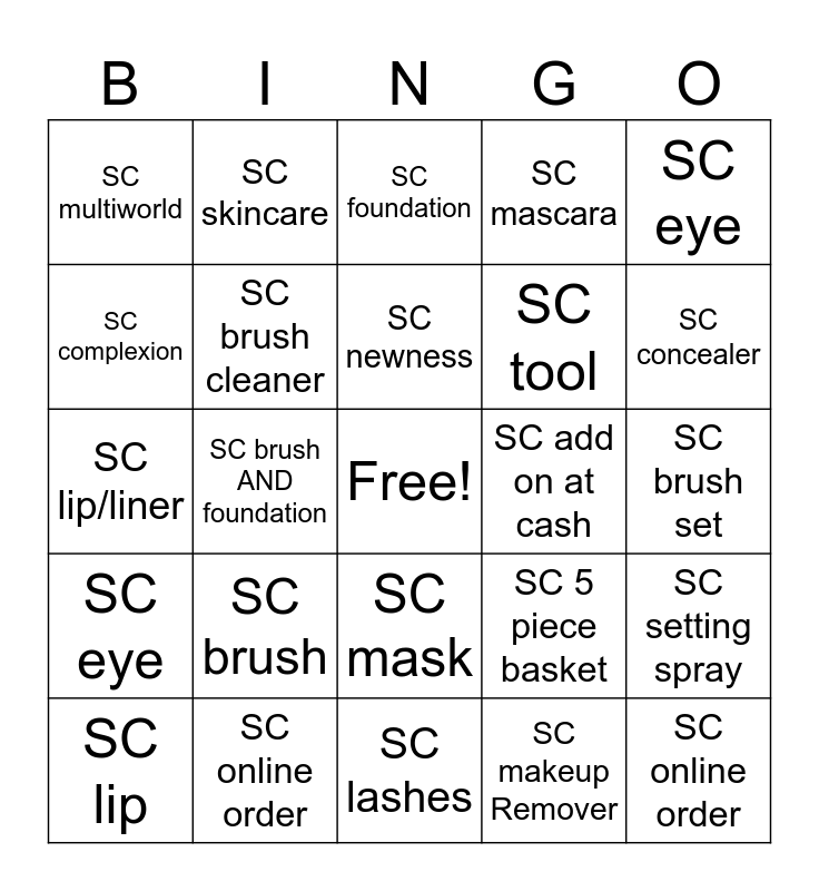 This bingo card has a free space and 24 words: SC brush, SC online order, SC newness, SC lip, SC eye, SC multiworld, SC complexion, SC skincare, SC add on at cash, SC mask, SC tool, SC lip/liner, SC 5 piece basket, SC setting spray, SC brush cleaner, SC makeup Remover, SC brush set, SC foundation, SC concealer, SC brush AND foundation, SC online order, SC eye, SC mascara and SC lashes.