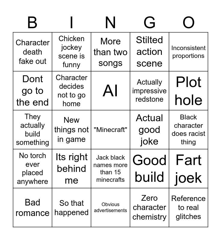 This bingo card has a free space and 24 words: Its right behind me, So that happened, AI, Bad romance, Inconsistent proportions, Character death fake out, Dont go to the end, Chicken jockey scene is funny, Actual good joke, Jack black names more than 15 minecrafts, Actually impressive redstone, They actually build something, Good build, Fart joek, Character decides not to go home, Zero character chemistry, Black character does racist thing, More than two songs, Plot hole, New things not in game, Reference to real glitches, No torch ever placed anywhere, Stilted action scene and Obvious advertisements.