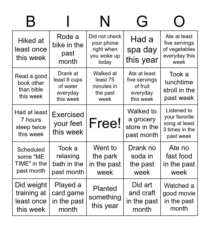 This bingo card has a free space and 24 words: Took a relaxing bath in the past month, Played a card game in the past month, Walked at least 75 minutes in the past week, Did weight training at least once this week, Ate at least five servings of vegetables everyday this week, Hiked at least once this week, Read a good book other than bible this week, Rode a bike in the past month, Walked to a grocery store in the past month, Went to the park in the past week, Ate at least five servings of fruit everyday this week, Had at least 7 hours sleep twice this week, Drank no soda in the past week, Ate no fast food in the past week, Drank at least 8 cups of water everyday this week, Did art and craft in the past month, Listened to your favorite song at least 3 times in the past week, Did not check your phone right when you woke up today, Took a lunchtime stroll in the past week, Exercised your feet this week, Watched a good movie in the past month, Scheduled some "ME TIME" in the past month, Had a spa day this year and Planted something this year.