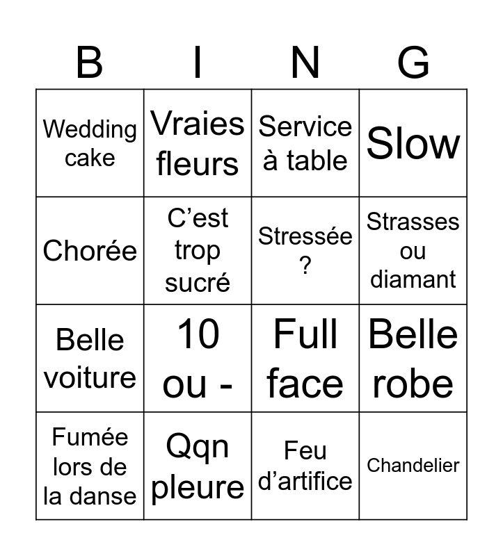 This bingo card has 16 words: Qqn pleure, Belle robe, Service à table, Wedding cake, Belle voiture, Vraies fleurs, Full face, Feu d’artifice, Chorée, C’est trop sucré, Fumée lors de la danse, Slow, 10 ou -, Strasses ou diamant, Stressée ? and Chandelier.