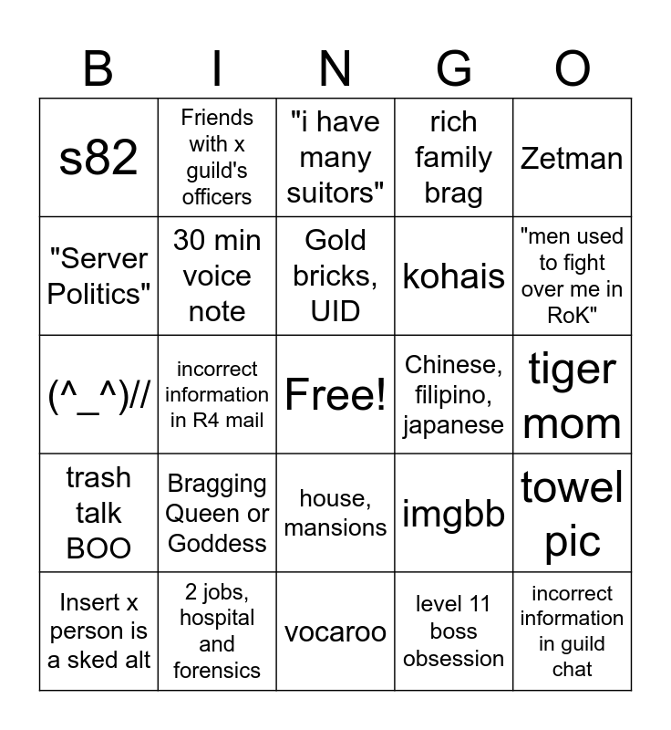This bingo card has a free space and 24 words: Bragging Queen or Goddess, 2 jobs, hospital and forensics, Gold bricks, UID, Insert x person is a sked alt, Zetman, s82, "Server Politics", Friends with x guild's officers, Chinese, filipino, japanese, house, mansions, kohais, (^_^)//, imgbb, towel pic, 30 min voice note, level 11 boss obsession, tiger mom, "i have many suitors", "men used to fight over me in RoK", incorrect information in R4 mail, incorrect information in guild chat, trash talk BOO, rich family brag and vocaroo.