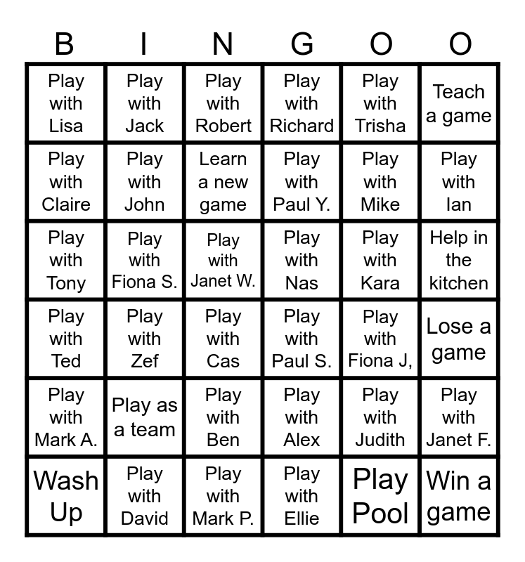 This bingo card has 36 words: Play with Alex, Play with Ben, Play with Ellie, Play with Claire, Play with Ted, Play with Nas, Play with John, Play with Mark P., Play with Trisha, Play with Judith, Play with Ian, Play with Richard, Play with Janet F., Play with Fiona S., Play with Paul Y., Play with Lisa, Play with Mark A., Play with Kara, Play with Tony, Play with Robert, Play with Janet W., Play with Zef, Play with Paul S., Play with Cas, Play with Fiona J,, Play with Jack, Play with Mike, Play with David, Learn a new game, Teach a game, Win a game, Wash Up, Lose a game, Help in the kitchen, Play as a team and Play Pool.
