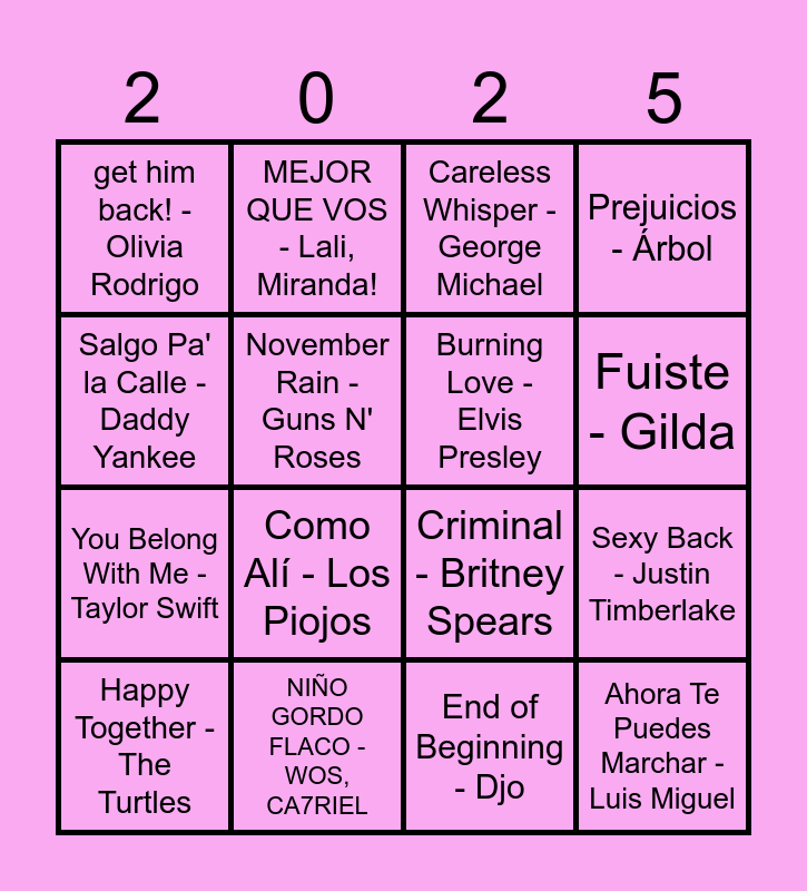 This bingo card has 30 words: Free!, Good Old-Fashioned Lover Boy - Queen, Sexy Back - Justin Timberlake, American Boy - Estelle, Kanye West, get him back! - Olivia Rodrigo, Careless Whisper - George Michael, Burning Love - Elvis Presley, Ritmo y Decepción - Miranda!, NIÑO GORDO FLACO - WOS, CA7RIEL, Hacer un puente - La Franela, End of Beginning - Djo, Happy Together - The Turtles, All My Loving - The Beatles, Y la Vida - Floricienta, Como Alí - Los Piojos, I Will Survive - Gloria Gaynor, Universo Paralelo - La K'onga, Nahuel Pennisi, Ahora Te Puedes Marchar - Luis Miguel, Radios - Emmanuel Horvilleur, Salgo Pa' la Calle - Daddy Yankee, Criminal - Britney Spears, Lento - Julieta Venegas, MEJOR QUE VOS - Lali, Miranda!, You Belong With Me - Taylor Swift, November Rain - Guns N' Roses, Prejuicios - Árbol, Loba - Shakira, Cuando Pase el Temblor - Soda Stereo, Fuiste - Gilda and One Way or Another - One Direction.