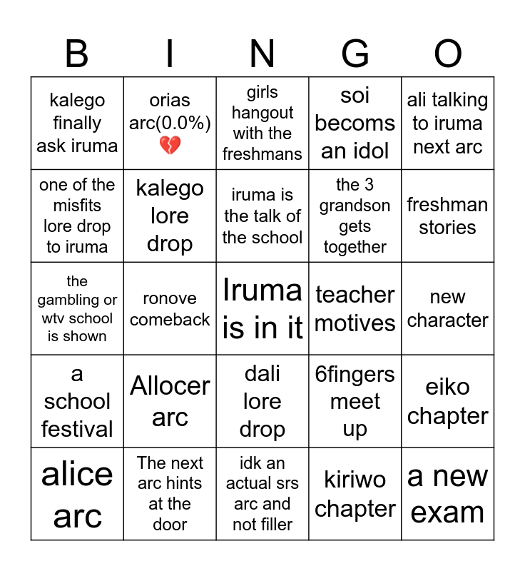 This bingo card has a free space and 24 words: Allocer arc, The next arc hints at the door, iruma is the talk of the school, alice arc, ali talking to iruma next arc, kalego finally ask iruma, one of the misfits lore drop to iruma, orias arc(0.0%)💔, teacher motives, dali lore drop, the 3 grandson gets together, the gambling or wtv school is shown, 6fingers meet up, eiko chapter, kalego lore drop, kiriwo chapter, new character, girls hangout with the freshmans, freshman stories, ronove comeback, a new exam, a school festival, soi becoms an idol and idk an actual srs arc and not filler.