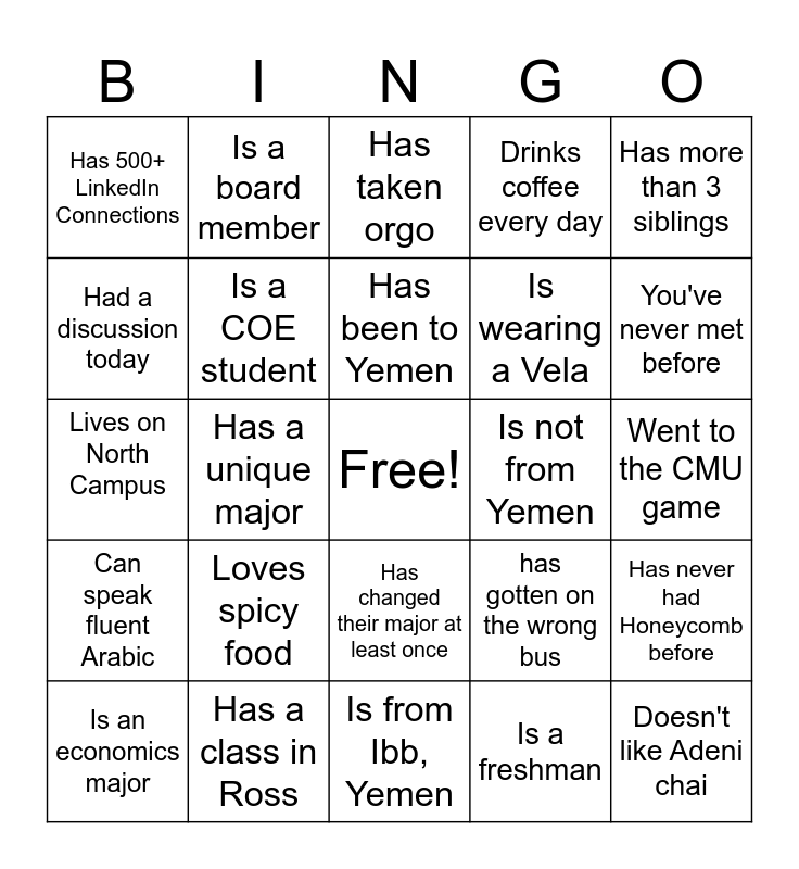This bingo card has a free space and 24 words: Loves spicy food, Has a class in Ross, Has been to Yemen, Is an economics major, Has more than 3 siblings, Has 500+ LinkedIn Connections, Had a discussion today, Is a board member, Is not from Yemen, Has changed their major at least once, Is wearing a Vela, Lives on North Campus, has gotten on the wrong bus, Has never had Honeycomb before, Is a COE student, Is a freshman, Went to the CMU game, Has taken orgo, You've never met before, Has a unique major, Doesn't like Adeni chai, Can speak fluent Arabic, Drinks coffee every day and Is from Ibb, Yemen.
