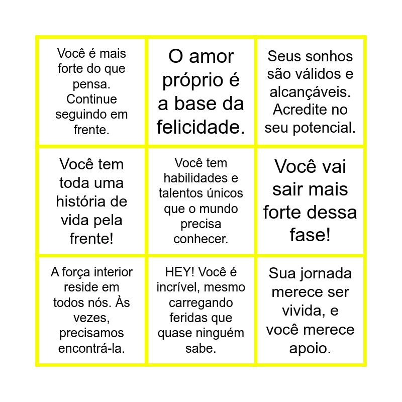 This bingo card has 18 words: Você é único e tem valor inestimável. Suas qualidades tornam o mundo melhor., Cada desafio superado fortalece sua capacidade de enfrentar novos obstáculos., Seus sonhos são válidos e alcançáveis. Acredite no seu potencial., Você é mais forte do que pensa. Continue seguindo em frente., Aprenda a amar a si mesmo, pois você é incrível do jeito que é., Você tem toda uma história de vida pela frente!, Você é único e especial. Nunca duvide disso., O amor próprio é a base da felicidade., HEY! Você é incrível, mesmo carregando feridas que quase ninguém sabe., Sua jornada merece ser vivida, e você merece apoio., O julgamento dos outros não diz nada sobre quem você realmente é., Você tem habilidades e talentos únicos que o mundo precisa conhecer., Seja paciente, algumas vezes precisamos passar pelo pior para ter o melhor., Você vai sair mais forte dessa fase!, A força interior reside em todos nós. Às vezes, precisamos encontrá-la., Quer você saiba ou não, o mundo precisa de seus talentos., Você tem a oportunidade de fazer algum tipo de diferença positiva neste mundo. and O fato de você estar vivo e ter um coração batendo é motivo suficiente para continuar..
