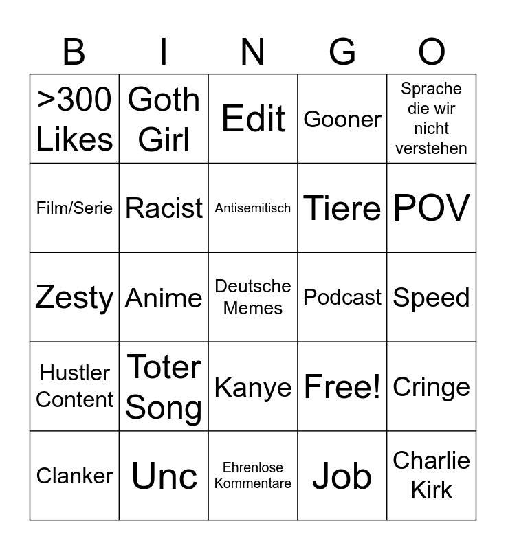 This bingo card has 25 words: Toter Song, Ehrenlose Kommentare, Antisemitisch, Clanker, Sprache die wir nicht verstehen, >300 Likes, Film/Serie, Goth Girl, Podcast, Kanye, Tiere, Zesty, Free!, Cringe, Racist, Charlie Kirk, Speed, Edit, POV, Anime, Deutsche Memes, Unc, Hustler Content, Gooner and Job.