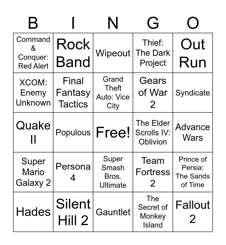 This bingo card has a free space and 337 words: The Oregon Trail, Pong, Combat, Zork, Space Invaders, Asteroids, Adventure, Battlezone, Missile Command, Pac-Man, Centipede, Defender, Donkey Kong, Frogger, Galaga, Tempest, Wizardry: Proving Grounds of the Mad Overlord, Joust, Ms. Pac-Man, Pitfall!, Robotron: 2084, Archon: The Light and the Dark, Lode Runner, M.U.L.E., Star Wars, Elite, Marble Madness, Gauntlet, Ghosts 'n Goblins, Super Mario Bros., Tetris, Ultima IV: Quest of the Avatar, Arkanoid, Bubble Bobble, The Legend of Zelda, Out Run, Contra, Double Dragon, Dungeon Master, Mike Tyson's Punch-Out!!, R-Type, Sid Meier's Pirates!, Mega Man 2, Ninja Gaiden, Super Mario Bros. 3, Final Fight, Populous, Prince of Persia, SimCity, The Secret of Monkey Island, Speedball 2: Brutal Deluxe, Super Mario World, Wing Commander, Another World, Civilization, Final Fantasy IV, The Legend of Zelda: A Link to the Past, Lemmings, Micro Machines, Monkey Island 2: LeChuck's Revenge, Sonic the Hedgehog, Street Fighter II, Super Castlevania IV, Alone in the Dark, Contra III: The Alien Wars, Dune II, Flashback, Indiana Jones and the Fate of Atlantis, Mortal Kombat, Sensible Soccer, Sonic the Hedgehog 2, Star Control II, Streets of Rage 2, Super Mario Kart, Ultima VII: The Black Gate, Virtua Racing, Wolfenstein 3D, Day of the Tentacle, Doom, Gunstar Heroes, The Legend of Zelda: Link's Awakening, Mega Man X, Mortal Kombat II, Myst, NBA Jam, Phantasy Star IV, Ridge Racer, Sam & Max Hit the Road, Secret of Mana, Samurai Shodown, SimCity 2000, Star Fox, Syndicate, Daytona USA, Donkey Kong Country, Doom II, EarthBound, Final Fantasy VI, Sensible World of Soccer, Star Wars: TIE Fighter, Super Metroid, Tempest 2000, Theme Park, Virtua Fighter 2, X-COM: UFO Defense, Chrono Trigger, Command & Conquer, MechWarrior 2: 31st Century Combat, Sega Rally Championship, Warcraft II: Tides of Darkness, Wipeout, Worms, Yoshi's Island, Civilization II, Command & Conquer: Red Alert, Duke Nukem 3D, Mario Kart 64, Nights into Dreams, PaRappa the Rapper, Pokémon Red and Blue, Quake, Resident Evil, Super Mario 64, Tomb Raider, Wave Race 64, Wipeout 2097, Age of Empires, Castlevania: Symphony of the Night, Diablo, Fallout, Final Fantasy Tactics, Final Fantasy VII, GoldenEye 007, Gran Turismo, Grand Theft Auto, Quake II, Star Fox 64, Star Wars Jedi Knight: Dark Forces II, Tekken 3, Total Annihilation, Ultima Online, Baldur's Gate, Crash Bandicoot: Warped, Dance Dance Revolution, Fallout 2, Grim Fandango, Half-Life, The Legend of Zelda: Ocarina of Time, Metal Gear Solid, Panzer Dragoon Saga, Resident Evil 2, Soulcalibur, StarCraft, Suikoden II, Thief: The Dark Project, Age of Empires II, EverQuest, Homeworld, Planescape: Torment, Pokémon Gold and Silver, Quake III: Arena, Shenmue, Silent Hill, System Shock 2, Tony Hawk's Pro Skater, Unreal Tournament, Baldur's Gate II: Shadows of Amn, Counter-Strike, Deus Ex, Diablo II, Jet Set Radio, The Legend of Zelda: Majora's Mask, Perfect Dark, Marvel vs. Capcom 2: New Age of Heroes, The Sims, Thief II: The Metal Age, Tony Hawk's Pro Skater 2, Vagrant Story, Advance Wars, Animal Crossing, Devil May Cry, Final Fantasy X, Gran Turismo 3: A-Spec, Grand Theft Auto III, Halo: Combat Evolved, Ico, Ikaruga, Max Payne, Metal Gear Solid 2: Sons of Liberty, Phoenix Wright: Ace Attorney, Rez, Silent Hill 2, Super Smash Bros. Melee, Tony Hawk's Pro Skater 3, Battlefield 1942, The Elder Scrolls III: Morrowind, Eternal Darkness: Sanity's Requiem, Grand Theft Auto: Vice City, Kingdom Hearts, The Legend of Zelda: The Wind Waker, Metroid Prime, Soulcalibur II, Tom Clancy's Splinter Cell, Warcraft III: Reign of Chaos, Beyond Good & Evil, F-Zero GX, Max Payne 2: The Fall of Max Payne, Prince of Persia: The Sands of Time, Star Wars: Knights of the Old Republic, WarioWare, Inc.: Mega Microgames!, Burnout 3: Takedown, The Chronicles of Riddick: Escape from Butcher Bay, Dragon Quest VIII, Gran Turismo 4, Grand Theft Auto: San Andreas, Half-Life 2, Halo 2, Katamari Damacy, Metal Gear Solid 3: Snake Eater, Paper Mario: The Thousand-Year Door, Rome: Total War, The Sims 2, World of Warcraft, Call of Duty 2, Civilization IV, Devil May Cry 3: Dante's Awakening, God of War, Guitar Hero, Kingdom Hearts II, Psychonauts, Resident Evil 4, Shadow of the Colossus, Tom Clancy's Splinter Cell: Chaos Theory, Company of Heroes, The Elder Scrolls IV: Oblivion, Gears of War, Hitman: Blood Money, The Legend of Zelda: Twilight Princess, Ōkami, Wii Sports, BioShock, Call of Duty 4: Modern Warfare, God of War II, Halo 3, Mass Effect, Peggle, Portal, Rock Band, Super Mario Galaxy, Team Fortress 2, The World Ends with You, Braid, Burnout Paradise, Dead Space, Fable II, Fallout 3, Gears of War 2, Grand Theft Auto IV, Left 4 Dead, LittleBigPlanet, Persona 4, Rock Band 2, Spelunky, Street Fighter IV, Super Smash Bros. Brawl, Valkyria Chronicles, Angry Birds, Assassin's Creed II, Batman: Arkham Asylum, Bayonetta, Borderlands, Demon's Souls, Dragon Age: Origins, League of Legends, Left 4 Dead 2, Plants vs. Zombies, The Sims 3, Uncharted 2: Among Thieves, Assassin's Creed: Brotherhood, Civilization V, Fallout: New Vegas, God of War III, Heavy Rain, Limbo, Mass Effect 2, Red Dead Redemption, Rock Band 3, StarCraft II: Wings of Liberty, Super Mario Galaxy 2, Super Meat Boy, Xenoblade Chronicles, Batman: Arkham City, Dark Souls, The Elder Scrolls V: Skyrim, Minecraft, Portal 2, Borderlands 2, Dishonored, Far Cry 3, Fire Emblem Awakening, Hotline Miami, Journey, The Walking Dead, XCOM: Enemy Unknown, BioShock Infinite, Dota 2, Grand Theft Auto V, The Last of Us, Papers, Please, Alien: Isolation, Destiny, Hearthstone, Mario Kart 8, Shovel Knight, Bloodborne, Rocket League, Undertale, The Witcher 3: Wild Hunt, Dishonored 2, Inside, Overwatch, Persona 5, Stardew Valley, Uncharted 4: A Thief's End, Fortnite, Hollow Knight, The Legend of Zelda: Breath of the Wild, Super Mario Odyssey, Celeste, God of War, Red Dead Redemption 2, Super Smash Bros. Ultimate, 