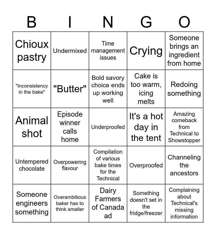 This bingo card has 35 words: "Pastry shop in Paris", A baker helps someone else with decorating, "My partner", "Butter", Compilation of various bake times for the Technical, Crying, "Inconsistency in the bake", Pity laughing at a pun, Bold savory choice ends up working well, Technical challenge no one's heard of, Animal shot, Someone brings an ingredient from home, Oven staring, Baker forgets an ingredient, Chioux pastry, It's a hot day in the tent, Something doesn't set in the fridge/freezer, Episode winner calls home, Untempered chocolate, Underproofed, Overproofed, Someone engineers something, Channeling the ancestors, Overambitious baker has to think smaller, Time management issues, Redoing something, Complaining about Technical's missing information, Gratuitous shot of sponsor product, Cake is too warm, icing melts, Amazing comeback from Technical to Showstopper, We predict both the star baker and boot, Dairy Farmers of Canada ad, Overpowering flavour, Undermixed and Overmixed.