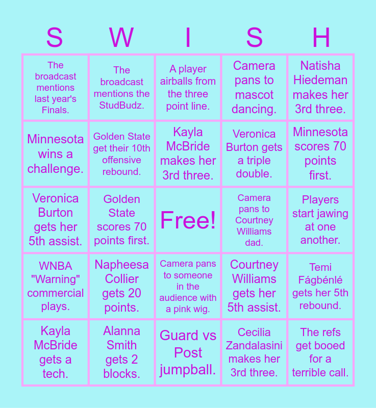 This bingo card has a free space and 24 words: Napheesa Collier gets 20 points., Alanna Smith gets 2 blocks., Kayla McBride makes her 3rd three., Kayla McBride gets a tech., Natisha Hiedeman makes her 3rd three., The broadcast mentions last year's Finals., Minnesota wins a challenge., The broadcast mentions the StudBudz., Camera pans to Courtney Williams dad., Camera pans to someone in the audience with a pink wig., Veronica Burton gets a triple double., Veronica Burton gets her 5th assist., Courtney Williams gets her 5th assist., Temi Fágbénlé gets her 5th rebound., Golden State get their 10th offensive rebound., Cecilia Zandalasini makes her 3rd three., Players start jawing at one another., A player airballs from the three point line., Minnesota scores 70 points first., Golden State scores 70 points first., The refs get booed for a terrible call., WNBA "Warning" commercial plays., Camera pans to mascot dancing. and Guard vs Post jumpball..