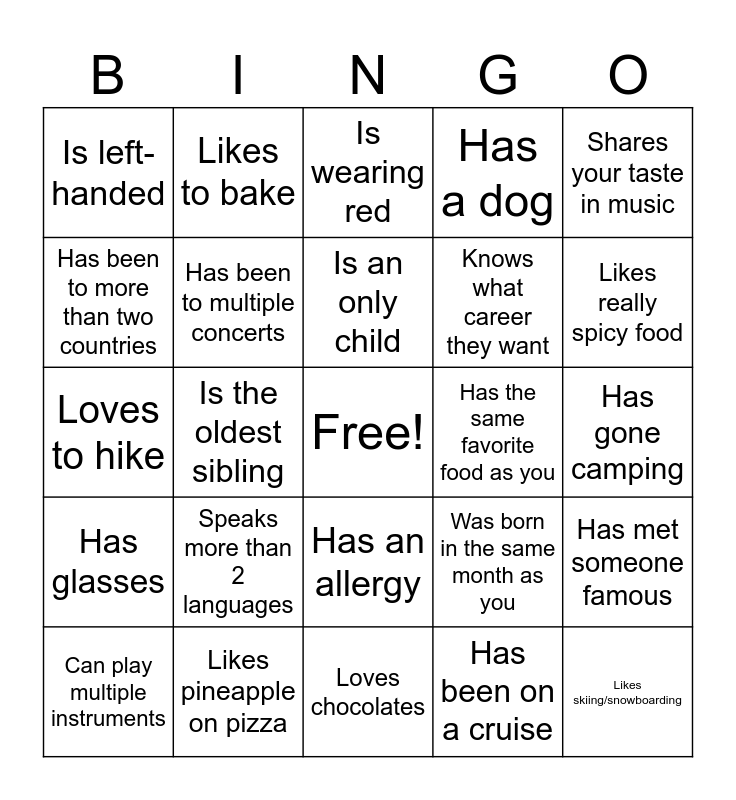 This bingo card has a free space and 24 words: Speaks more than 2 languages, Likes pineapple on pizza, Is an only child, Can play multiple instruments, Shares your taste in music, Is left-handed, Has been to more than two countries, Likes to bake, Has the same favorite food as you, Has an allergy, Knows what career they want, Loves to hike, Was born in the same month as you, Has met someone famous, Has been to multiple concerts, Has been on a cruise, Has gone camping, Is wearing red, Likes really spicy food, Is the oldest sibling, Likes skiing/snowboarding, Has glasses, Has a dog and Loves chocolates.