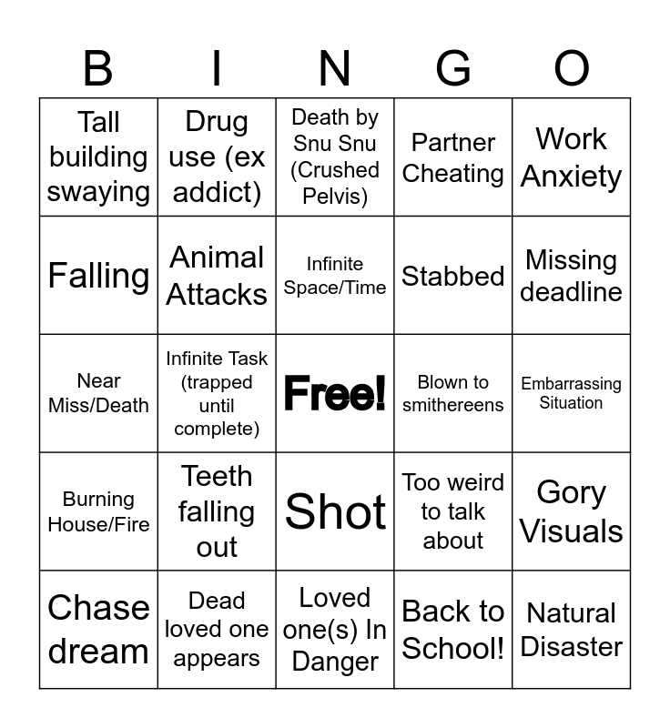This bingo card has a free space and 24 words: Teeth falling out, Dead loved one appears, Infinite Space/Time, Chase dream, Work Anxiety, Tall building swaying, Falling, Drug use (ex addict), Blown to smithereens, Shot, Stabbed, Near Miss/Death, Too weird to talk about, Gory Visuals, Animal Attacks, Back to School!, Embarrassing Situation, Death by Snu Snu (Crushed Pelvis), Missing deadline, Infinite Task (trapped until complete), Natural Disaster, Burning House/Fire, Partner Cheating and Loved one(s) In Danger.