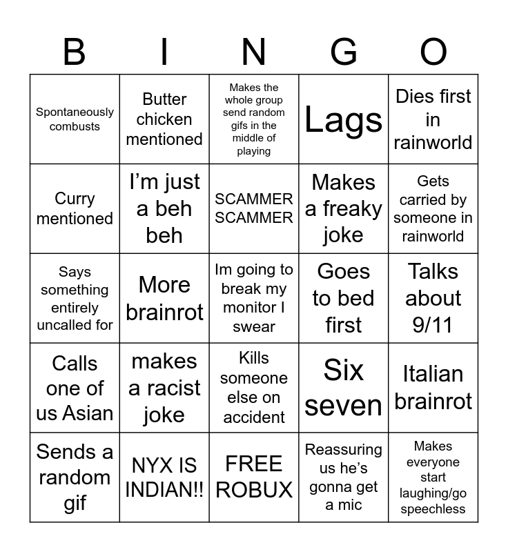 This bingo card has a free space and 24 words: makes a racist joke, NYX IS INDIAN!!, SCAMMER SCAMMER, Sends a random gif, Dies first in rainworld, Spontaneously combusts, Curry mentioned, Butter chicken mentioned, Goes to bed first, Kills someone else on accident, Makes a freaky joke, Says something entirely uncalled for, Six seven, Italian brainrot, I’m just a beh beh, Reassuring us he’s gonna get a mic, Talks about 9/11, Makes the whole group send random gifs in the middle of playing, Gets carried by someone in rainworld, More brainrot, Makes everyone start laughing/go speechless, Calls one of us Asian, Lags and FREE ROBUX.