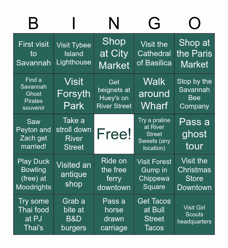 This bingo card has a free space and 34 words: 5 Trees with Spanish Moss, Get Tacos at Bull Street Tacos, Explore a cemetary, Snap a picture in one of the historic squares, Play Duck Bowling (free) at Moodrights, Visit Forsyth Park, Shop at the Paris Market, Try some Thai food at PJ Thai's, Visit Tybee Island Lighthouse, Visit a rooftop bar, Get beignets at Huey's on River Street, Shop at City Market, Tried Leopold's ice cream, Grab a bite or a drink at Mint to Be Mojito, Try a praline at River Street Sweets (any location), Stop by the Savannah Bee Company, Grab a bite at B&D burgers, Saw Peyton and Zach get married!, Visited an antique shop, Visit Forest Gump in Chippewa Square, Ride on the free ferry downtown, Find a Savannah Banana's Shirt, First visit to Savannah, Pass a ghost tour, Pass a horse drawn carriage, Visit Girl Scouts headquarters, Visit the Cathedral of Basilica, Grab a drink at Arco's, Walk around Wharf, Find a Savannah Ghost Pirates souvenir, Take a photo with the "Jingle Bells" Church, Take a stroll down River Street, Visit the Christmas Store Downtown and Visit the Marriott Dinosaur.
