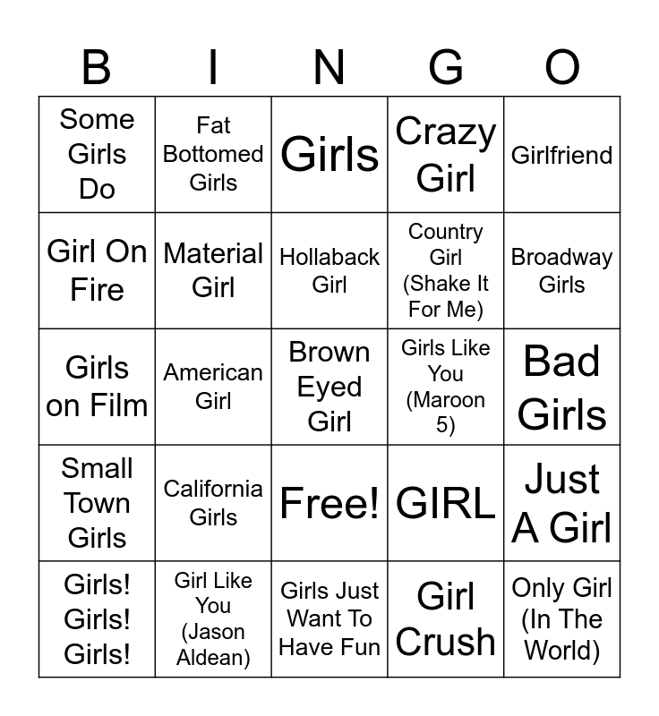 This bingo card has 44 words: Uptown Girl, Brown Eyed Girl, Jessie's Girl, Girls! Girls! Girls!, My Girl, Girl Crush, Girls, Rich Girl, Girlfriend, Girl Like You (Jason Aldean), Crazy Girl, Girls Like You (Maroon 5), Free!, California Girls, The Girl From Ipanema, Girls Just Want To Have Fun, Girls Chase Boys, Girls on Film, Beautiful Girls, Broadway Girls, Fat Bottomed Girls, Where Them Girls At, Good Girls Go Bad, Some Girls Do, Big Girls Don't Cry, Bad Girls, Young Girls, All The Pretty Girls, GIRL, Small Town Girls, Girl In A Country Song, Just A Girl, Brandy (You're a Fine Girl), Girl All The Bad Guys Want, American Girl, My Best's Friends Girl, Hot Girl Bummer, Only Girl (In The World), Hollaback Girl, Girl On Fire, Country Girl (Shake It For Me), Run The World (Girls), Material Girl and I Kissed A Girl.