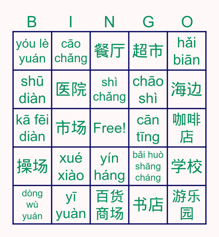 This bingo card has a free space and 24 words: xué xiào, yī yuàn, shì chǎng, dòng wù yuán, hǎi biān, yóu lè yuán, shū diàn, cāo chǎng, cān tīng, yín háng, chāo shì, kā fēi diàn, bǎi huò shāng cháng, 学校, 医院, 书店, 咖啡店, 餐厅, 海边, 市场, 游乐园, 操场, 超市 and 百货商场.