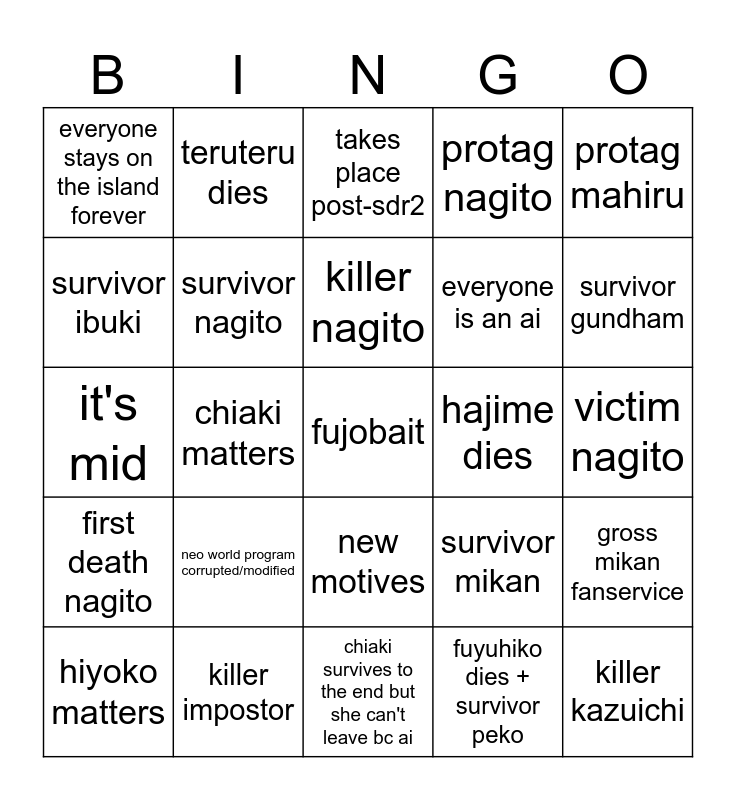 This bingo card has a free space and 24 words: hiyoko matters, neo world program corrupted/modified, killer nagito, fuyuhiko dies + survivor peko, protag mahiru, everyone stays on the island forever, teruteru dies, takes place post-sdr2, hajime dies, victim nagito, it's mid, survivor nagito, survivor mikan, gross mikan fanservice, survivor ibuki, killer impostor, chiaki survives to the end but she can't leave bc ai, protag nagito, survivor gundham, first death nagito, chiaki matters, new motives, everyone is an ai and killer kazuichi.