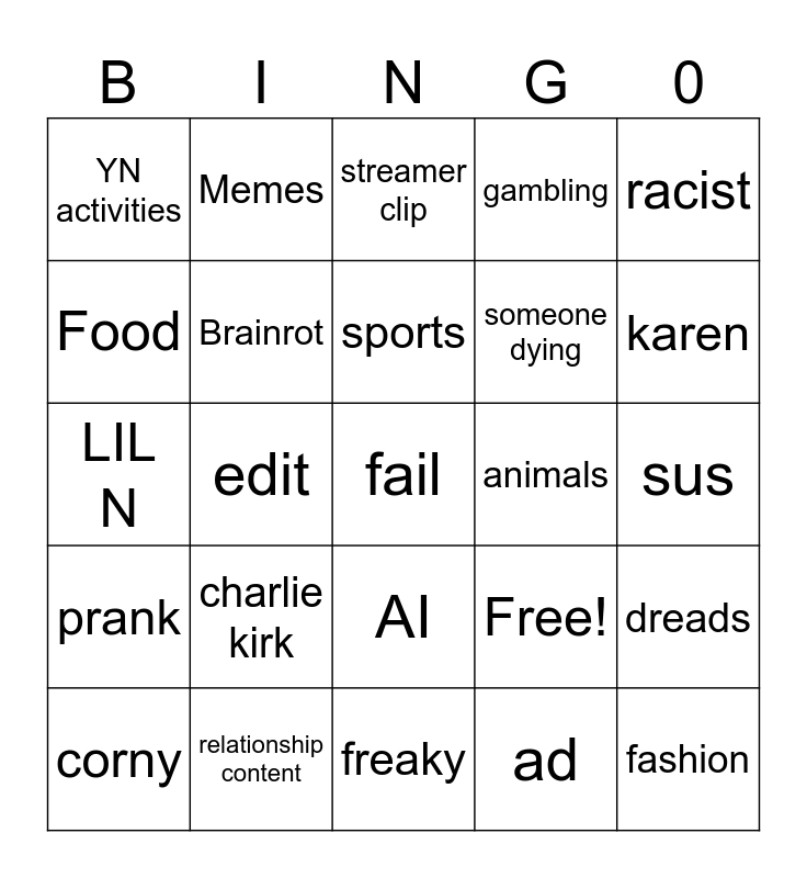 This bingo card has 25 words: charlie kirk, freaky, sports, corny, racist, YN activities, Food, Memes, animals, AI, someone dying, LIL N, Free!, dreads, Brainrot, fashion, sus, streamer clip, karen, edit, fail, relationship content, prank, gambling and ad.