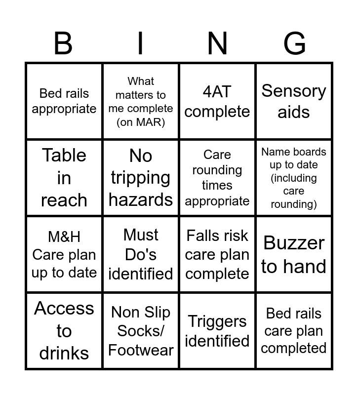 This bingo card has 16 words: Non Slip Socks/ Footwear, Buzzer to hand, 4AT complete, Bed rails appropriate, M&H Care plan up to date, What matters to me complete (on MAR), Falls risk care plan complete, Triggers identified, Table in reach, No tripping hazards, Access to drinks, Sensory aids, Must Do's identified, Name boards up to date (including care rounding), Care rounding times appropriate and Bed rails care plan completed.