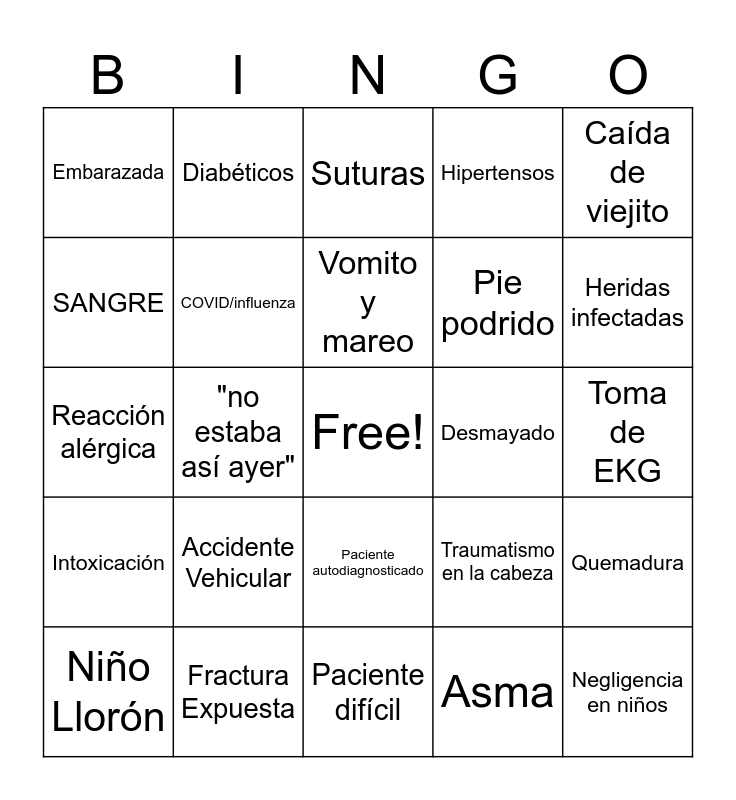 This bingo card has a free space and 24 words: Accidente Vehicular, Fractura Expuesta, Vomito y mareo, Niño Llorón, Caída de viejito, Embarazada, SANGRE, Diabéticos, Desmayado, Paciente autodiagnosticado, Pie podrido, Reacción alérgica, Traumatismo en la cabeza, Quemadura, COVID/influenza, Asma, Toma de EKG, Suturas, Heridas infectadas, "no estaba así ayer", Negligencia en niños, Intoxicación, Hipertensos and Paciente difícil.