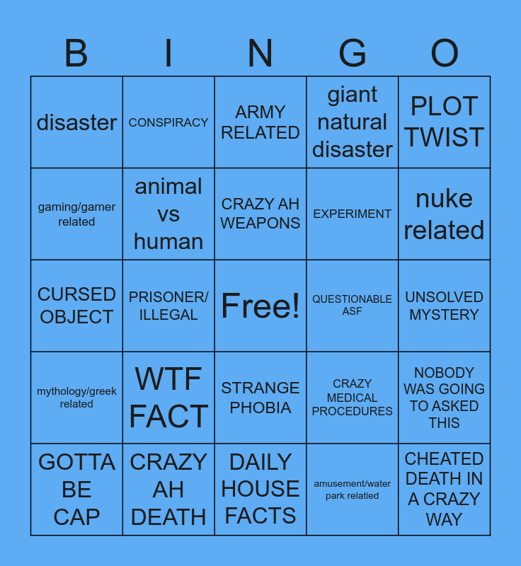 This bingo card has a free space and 24 words: WTF FACT, CRAZY AH DEATH, CRAZY AH WEAPONS, GOTTA BE CAP, PLOT TWIST, disaster, gaming/gamer related, CONSPIRACY, QUESTIONABLE ASF, STRANGE PHOBIA, EXPERIMENT, CURSED OBJECT, CRAZY MEDICAL PROCEDURES, NOBODY WAS GOING TO ASKED THIS, animal vs human, amusement/water park relatied, UNSOLVED MYSTERY, ARMY RELATED, nuke related, PRISONER/ ILLEGAL, CHEATED DEATH IN A CRAZY WAY, mythology/greek related, giant natural disaster and DAILY HOUSE FACTS.