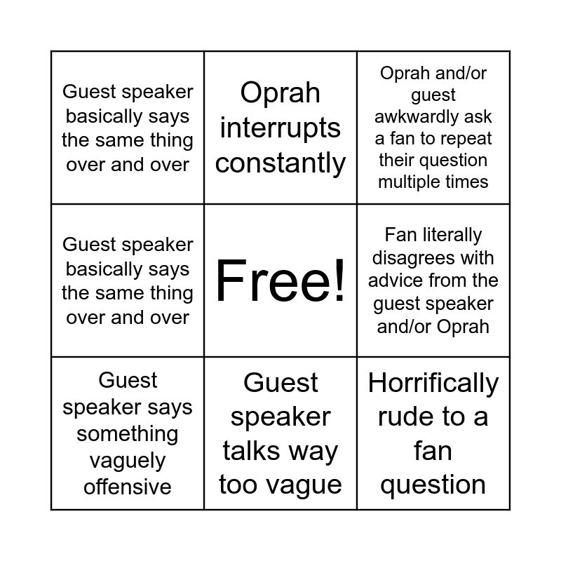 This bingo card has a free space and 11 words: Guest speaker basically says the same thing over and over, Guest speaker talks way too vague, Horrifically rude to a fan question, Guest speaker says something vaguely offensive, Oprah interrupts constantly, Oprah and/or guest awkwardly ask a fan to repeat their question multiple times, Fan literally disagrees with advice from the guest speaker and/or Oprah, Oprah says the title of the book x1000, Guest speaker basically says the same thing over and over, Guest speaker basically says the same thing over and over and Guest speaker basically says the same thing over and over.
