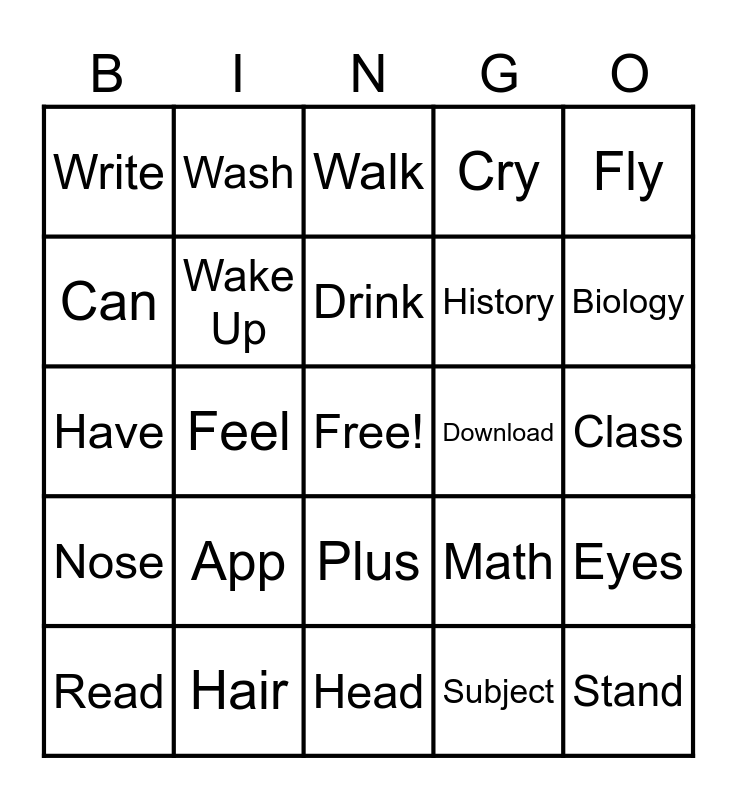This bingo card has a free space and 75 words: Foot/Feet, Run, Walk, Go, Read, Learn, Want, Like, Take, Give, Work, Help, Drink, Can, Cannot, Feel, Jump, Stand, Have to, Fly, Sleep, Have, Wake Up, Wash, Cry, Pick Up, Love, Open, Close, Stop, Read, Run, Cannot, Math, Biology, History, Language, Classroom, Class, Subject, Schedule, Student, Study, Teacher, Homework, Lot/Much, Read, Write, Paper, Exam/Test, Minus, Plus, Computer, iPad, Camera, Phone, Scanner, Keyboard, Printer, Charger, App, Chat, Internet, Google, Email, Download, Edit, Wifi, Face, Eyes, Nose, Hair, Body, Head and Back.