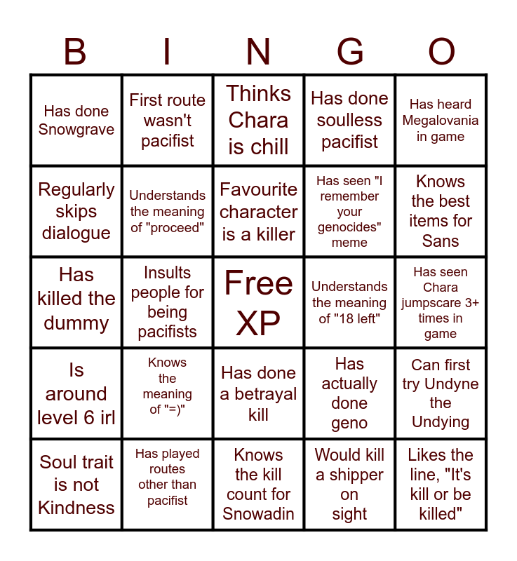 This bingo card has a free space and 24 words: Knows the meaning of "=)", Has played routes other than pacifist, Favourite character is a killer, Soul trait is not Kindness, Has heard Megalovania in game, Has done Snowgrave, Regularly skips dialogue, First route wasn't pacifist, Understands the meaning of "18 left", Has done a betrayal kill, Has seen "I remember your genocides" meme, Has killed the dummy, Has actually done geno, Can first try Undyne the Undying, Understands the meaning of "proceed", Would kill a shipper on sight, Has seen Chara jumpscare 3+ times in game, Thinks Chara is chill, Knows the best items for Sans, Insults people for being pacifists, Likes the line, "It's kill or be killed", Is around level 6 irl, Has done soulless pacifist and Knows the kill count for Snowadin.