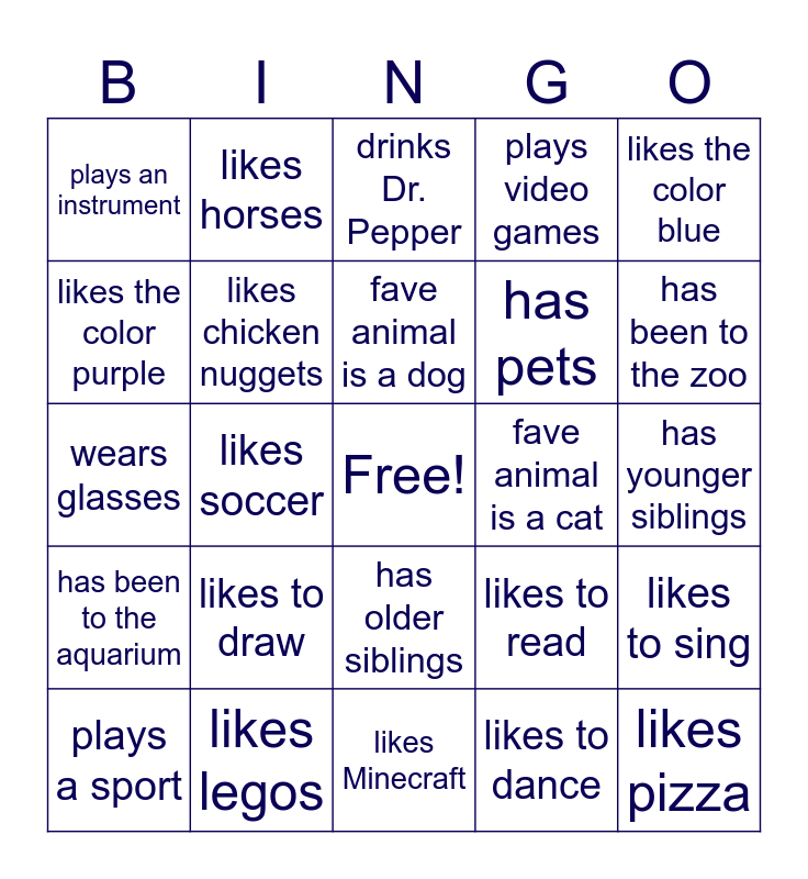 This bingo card has a free space and 24 words: likes to draw, likes legos, fave animal is a dog, plays a sport, likes the color blue, plays an instrument, likes the color purple, likes horses, fave animal is a cat, has older siblings, has pets, wears glasses, likes to read, likes to sing, likes chicken nuggets, likes to dance, has younger siblings, drinks Dr. Pepper, has been to the zoo, likes soccer, likes pizza, has been to the aquarium, plays video games and likes Minecraft.