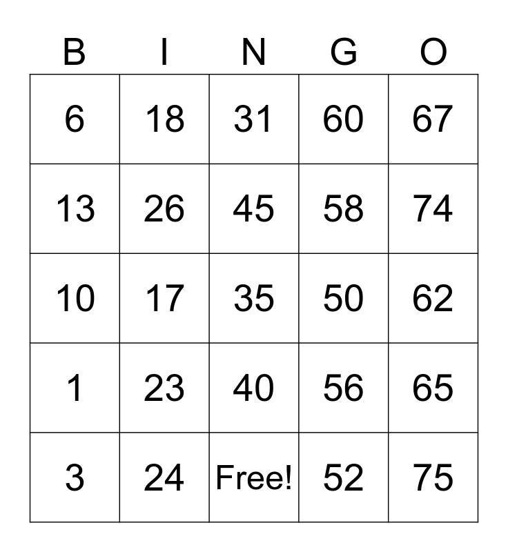 This bingo card has 25 words: 1, 24, 35, 52, 67, 6, 18, 31, 50, 65, 13, 26, Free!, 56, 74, 3, 17, 45, 58, 62, 10, 23, 40, 60 and 75.