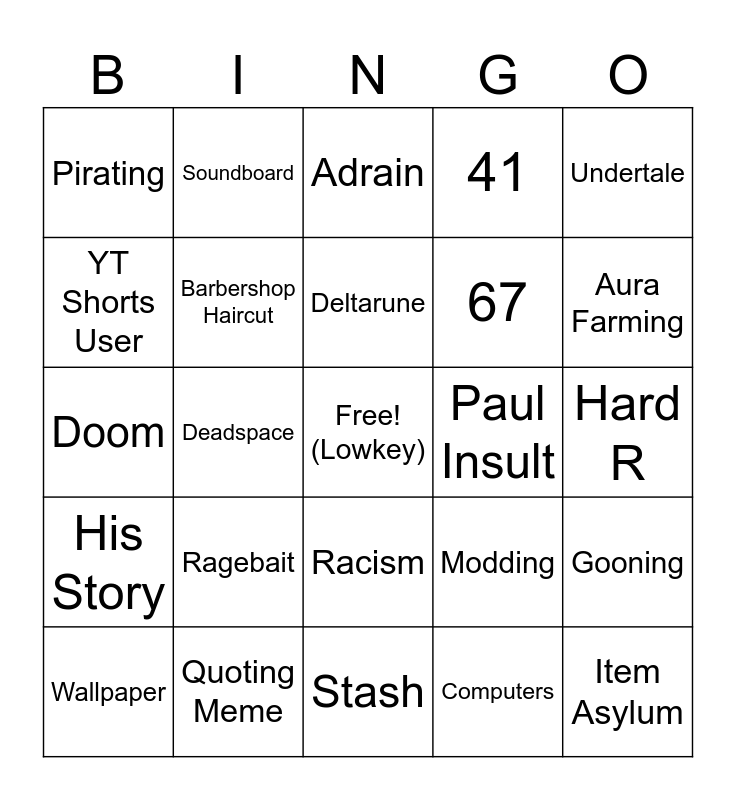 This bingo card has a free space and 24 words: Ragebait, Quoting Meme, Deltarune, Wallpaper, Undertale, Pirating, YT Shorts User, Soundboard, Paul Insult, Racism, 67, Doom, Modding, Gooning, Barbershop Haircut, Computers, Hard R, Adrain, Aura Farming, Deadspace, Item Asylum, His Story, 41 and Stash.