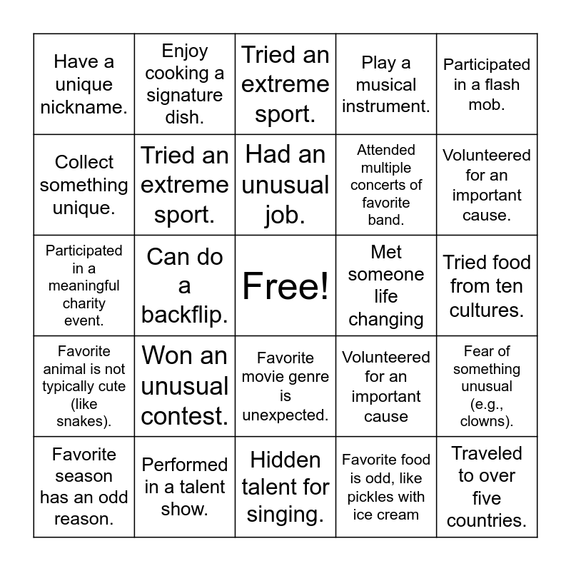 This bingo card has a free space and 50 words: Met a celebrity unexpectedly., Traveled to over five countries., Speak three or more languages., Hidden talent for singing., Won an unusual contest., Own a pet that’s not a dog or cat., Enjoy cooking a signature dish., Ran a marathon., Collect something unique., Went skydiving or bungee jumping., Tried an extreme sport., Play a musical instrument., Fear of something unusual (e.g., clowns)., Volunteered for an important cause, Lived in three or more places., Good at trivia games!, Had an unusual job., Met someone life changing, Read over 20 books last year., Participated in a flash mob., Can do a backflip., Favorite food is odd, like pickles with ice cream, Have a unique nickname., Attended multiple concerts of favorite band., Have an unusual fear., First job was unexpected., Volunteered for an important cause., Took a spontaneous trip., Tried an extreme sport., Favorite movie genre is unexpected., Embarrassing moment turned funny story., Can recite the alphabet backward., Favorite childhood toy was unusual., Had dinner with someone famous (sort of)., Performed in a talent show., Family has a quirky tradition., Can name all U.S. presidents in order., Mistaken for someone else before., Dream vacation is adventurous., Tried food from ten cultures., Good at trivia games!, Artwork displayed publicly (even locally)., Afraid of the dark but love horror movies!, Went on a spontaneous road trip., Favorite season has an odd reason., Participated in a meaningful charity event., Guilty pleasure TV show is unexpected., Learned something new as an adult (like surfing)., Favorite animal is not typically cute (like snakes). and Experienced something supernatural..