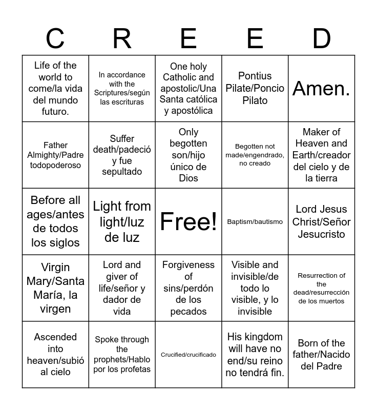 This bingo card has a free space and 24 words: Lord and giver of life/señor y dador de vida, Spoke through the prophets/Hablo por los profetas, Only begotten son/hijo único de Dios, Ascended into heaven/subió al cielo, Amen., Life of the world to come/la vida del mundo futuro., Father Almighty/Padre todopoderoso, In accordance with the Scriptures/según las escrituras, Baptism/bautismo, Forgiveness of sins/perdón de los pecados, Begotten not made/engendrado, no creado, Before all ages/antes de todos los siglos, Visible and invisible/de todo lo visible, y lo invisible, Resurrection of the dead/resurrección de los muertos, Suffer death/padeció y fue sepultado, His kingdom will have no end/su reino no tendrá fin., Lord Jesus Christ/Señor Jesucristo, One holy Catholic and apostolic/Una Santa católica y apostólica, Maker of Heaven and Earth/creador del cielo y de la tierra, Light from light/luz de luz, Born of the father/Nacido del Padre, Virgin Mary/Santa María, la virgen, Pontius Pilate/Poncio Pilato and Crucified/crucificado.