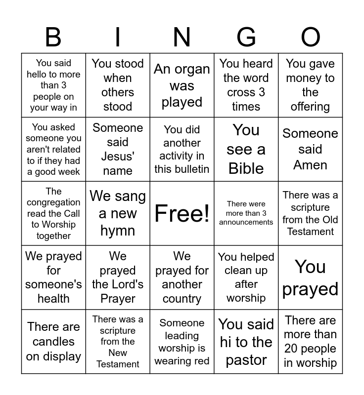 This bingo card has a free space and 29 words: There are candles on display, The word 'love' was said more than 5 times, We sang a new hymn, There was a baby at church, You said hello to more than 3 people on your way in, An organ was played, Someone said Jesus' name, We prayed the Lord's Prayer, There were more than 3 announcements, There was a scripture from the New Testament, There was a scripture from the Old Testament, There are more than 20 people in worship, Someone leading worship is wearing red, You said hi to the pastor, Someone said Amen, You saw the full cross at the front of the church, We prayed for another country, We prayed for someone's health, You gave money to the offering, The congregation read the Call to Worship together, You helped clean up after worship, Someone sneezed during the service, You see a Bible, You asked someone you aren't related to if they had a good week, You heard the word cross 3 times, You stood when others stood, You prayed, You did another activity in this bulletin and You helped someone.