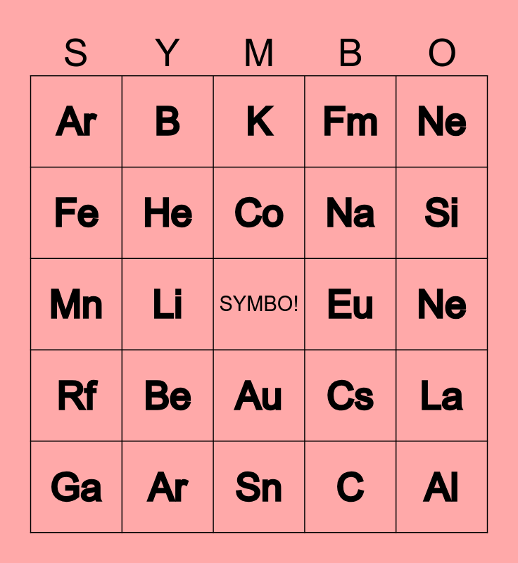 This bingo card has a free space and 24 words: Be, Ar, Co, Ga, Ne, Ar, Fe, B, Eu, Au, Na, Mn, Cs, La, He, C, Ne, K, Si, Li, Al, Rf, Fm and Sn.