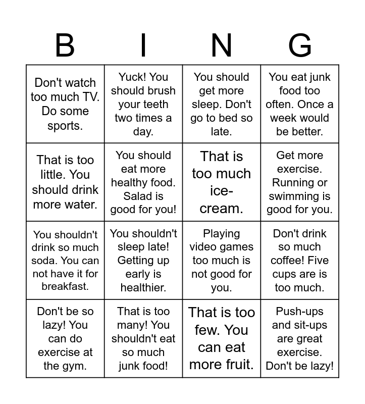 This bingo card has 16 words: That is too many! You shouldn't eat so much junk food!, Don't drink so much coffee! Five cups are is too much., You should get more sleep. Don't go to bed so late., Don't watch too much TV. Do some sports., You shouldn't drink so much soda. You can not have it for breakfast., Yuck! You should brush your teeth two times a day., Playing video games too much is not good for you., That is too few. You can eat more fruit., That is too little. You should drink more water., You should eat more healthy food. Salad is good for you!, Don't be so lazy! You can do exercise at the gym., You eat junk food too often. Once a week would be better., You shouldn't sleep late! Getting up early is healthier., Get more exercise. Running or swimming is good for you., That is too much ice-cream. and Push-ups and sit-ups are great exercise. Don't be lazy!.