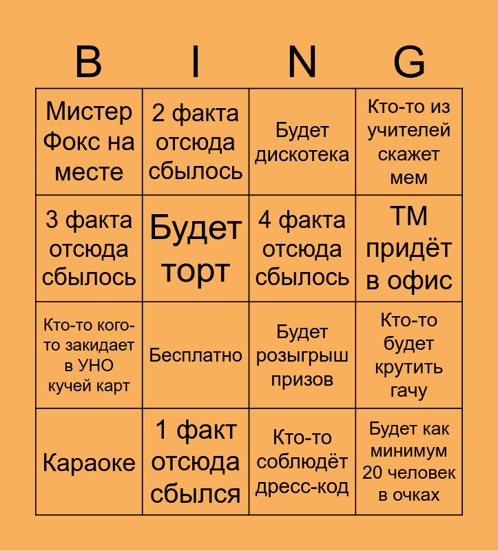 This bingo card has 16 words: 1 факт отсюда сбылся, Кто-то будет крутить гачу, Будет дискотека, Мистер Фокс на месте, Кто-то кого-то закидает в УНО кучей карт, 2 факта отсюда сбылось, Будет розыгрыш призов, Кто-то соблюдёт дресс-код, 3 факта отсюда сбылось, Будет торт, Караоке, Кто-то из учителей скажет мем, Бесплатно, ТМ придёт в офис, 4 факта отсюда сбылось and Будет как минимум 20 человек в очках.