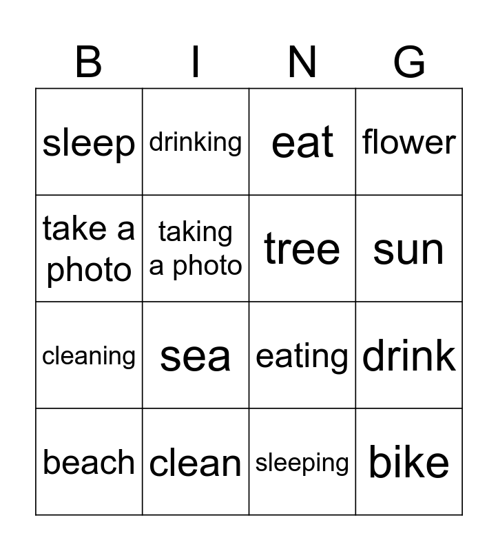 This bingo card has 16 words: clean, drink, eat, sleep, cleaning, drinking, eating, sleeping, take a photo, taking a photo, beach, flower, sea, sun, tree and bike.