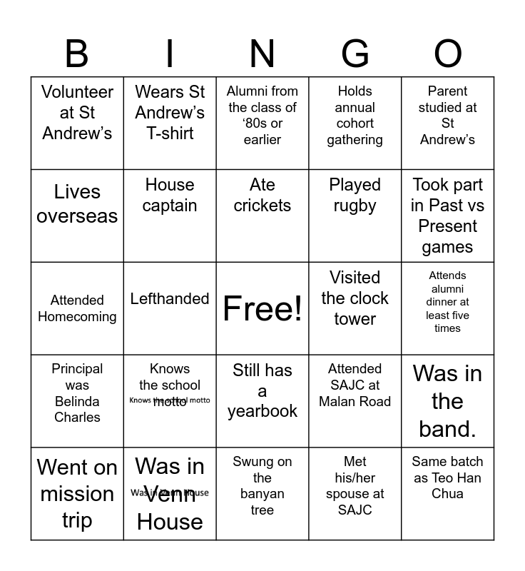 This bingo card has 2 images, a free space and 24 words: Knows the school motto, Was in Venn House, Ate crickets, Went on mission trip, Parent studied at St Andrew’s, Volunteer at St Andrew’s, Lives overseas, Wears St Andrew’s T-shirt, Visited the clock tower, Still has a yearbook, Played rugby, Attended Homecoming, Attended SAJC at Malan Road, Was in the band., House captain, Met his/her spouse at SAJC, Attends alumni dinner at least five times, Alumni from the class of ‘80s or earlier, Took part in Past vs Present games, Lefthanded, Same batch as Teo Han Chua, Principal was Belinda Charles, Holds annual cohort gathering and Swung on the banyan tree.