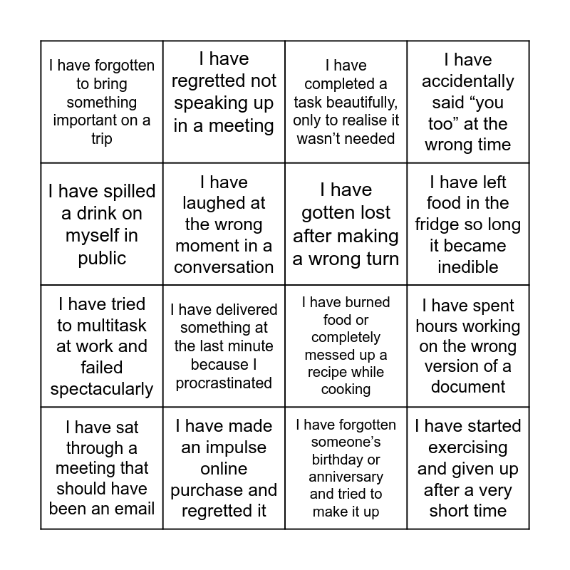 This bingo card has 20 words: I have spent hours working on the wrong version of a document, I have accidentally CC’d the wrong person in an email, I have completed a task beautifully, only to realise it wasn’t needed, I have blanked out during a presentation or pitch, I have sat through a meeting that should have been an email, I have spilled a drink on myself in public, I have made an impulse online purchase and regretted it, I have forgotten to bring something important on a trip, I have tried to multitask at work and failed spectacularly, I have regretted not speaking up in a meeting, I have delivered something at the last minute because I procrastinated, I have burned food or completely messed up a recipe while cooking, I have laughed at the wrong moment in a conversation, I have started exercising and given up after a very short time, I have gotten lost after making a wrong turn, I have dropped my phone or gadget and cracked the screen, I have left food in the fridge so long it became inedible, I have accidentally said “you too” at the wrong time, I have forgotten someone’s birthday or anniversary and tried to make it up and I have bought hobby supplies and never used them.