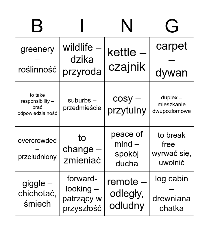 This bingo card has 16 words: forward-looking – patrzący w przyszłość, to break free – wyrwać się, uwolnić, kettle – czajnik, greenery – roślinność, overcrowded – przeludniony, wildlife – dzika przyroda, peace of mind – spokój ducha, remote – odległy, odludny, to take responsibility – brać odpowiedzialność, suburbs – przedmieście, giggle – chichotać, śmiech, carpet – dywan, to change – zmieniać, duplex – mieszkanie dwupoziomowe, cosy – przytulny and log cabin – drewniana chatka.