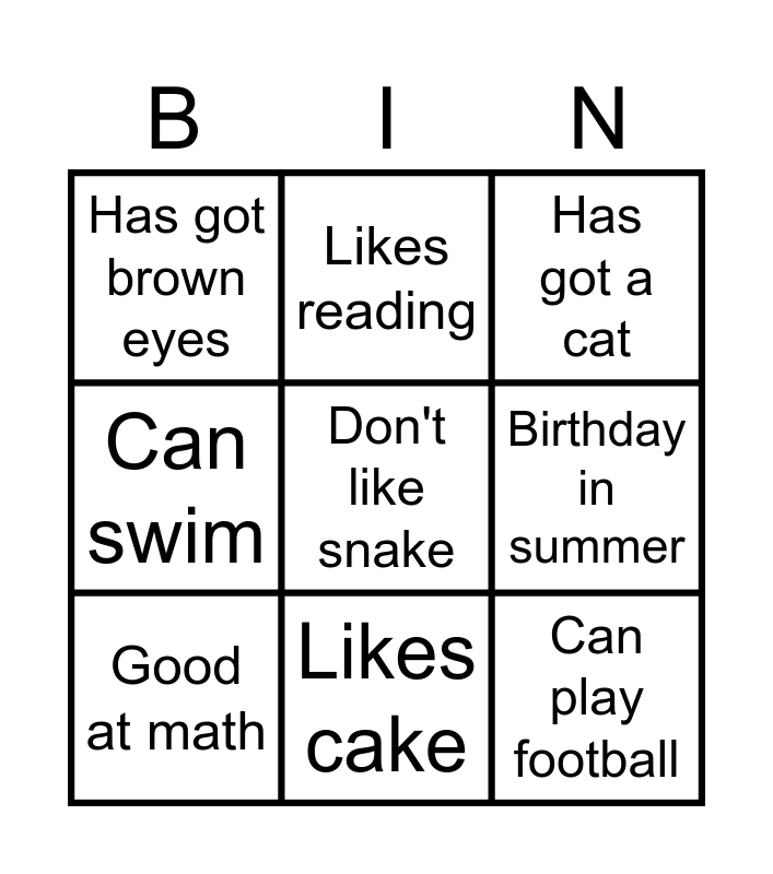 This bingo card has a free space and 8 words: Can swim, Likes reading, Birthday in summer, Good at math, Has got a cat, Has got brown eyes, Likes cake and Can play football.