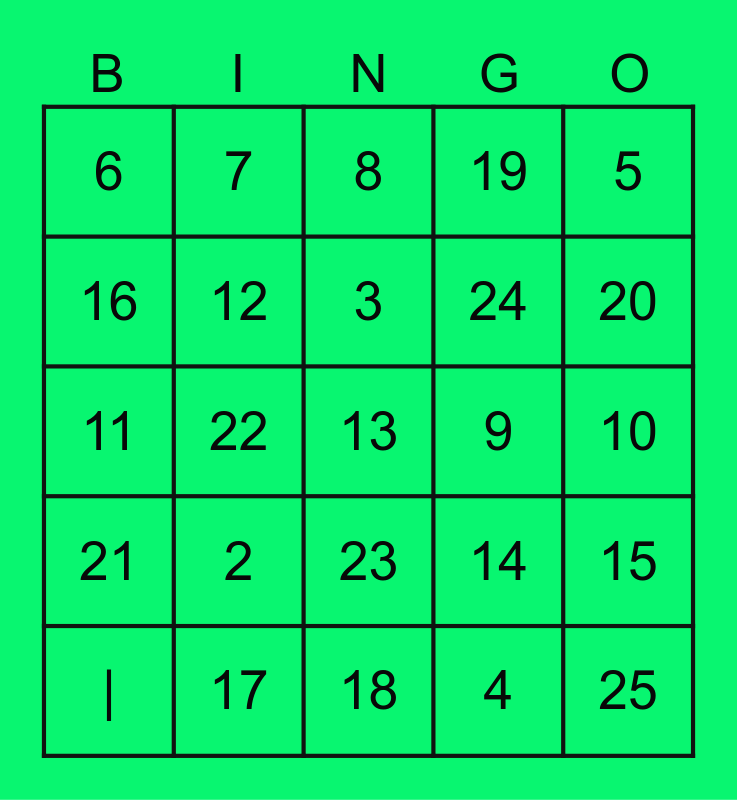 This bingo card has a free space and 24 words: |, 2, 3, 4, 5, 6, 7, 8, 9, 10, 11, 12, 14, 15, 16, 17, 18, 19, 20, 21, 22, 23, 24 and 25.
