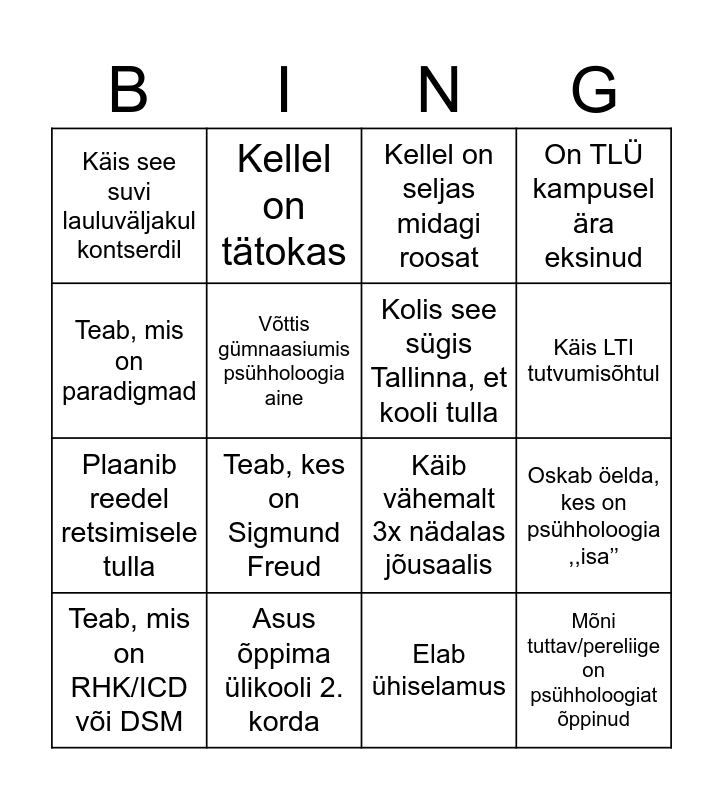 This bingo card has 21 words: Asus õppima ülikooli 2. korda, Käis möödunud nädalavahetus peol, Kellel on tätokas, Kelle nimes on täpitäht, Elab ühiselamus, Kolis see sügis Tallinna, et kooli tulla, Käis see suvi lauluväljakul kontserdil, Kellel on seljas midagi roosat, Käib vähemalt 3x nädalas jõusaalis, Käis LTI tutvumisõhtul, Plaanib reedel retsimisele tulla, On TLÜ kampusel ära eksinud, Mõni tuttav/pereliige on psühholoogiat õppinud, Oskab nimetada vähemalt 3 psühholoogi, Võttis gümnaasiumis psühholoogia aine, Meeldib lugeda raamatuid, Teab, mis on RHK/ICD või DSM, Teab, kes on Sigmund Freud, Teab, mis on paradigmad, Oskab öelda, kes on psühholoogia ,,isa’’ and Käib tööl.