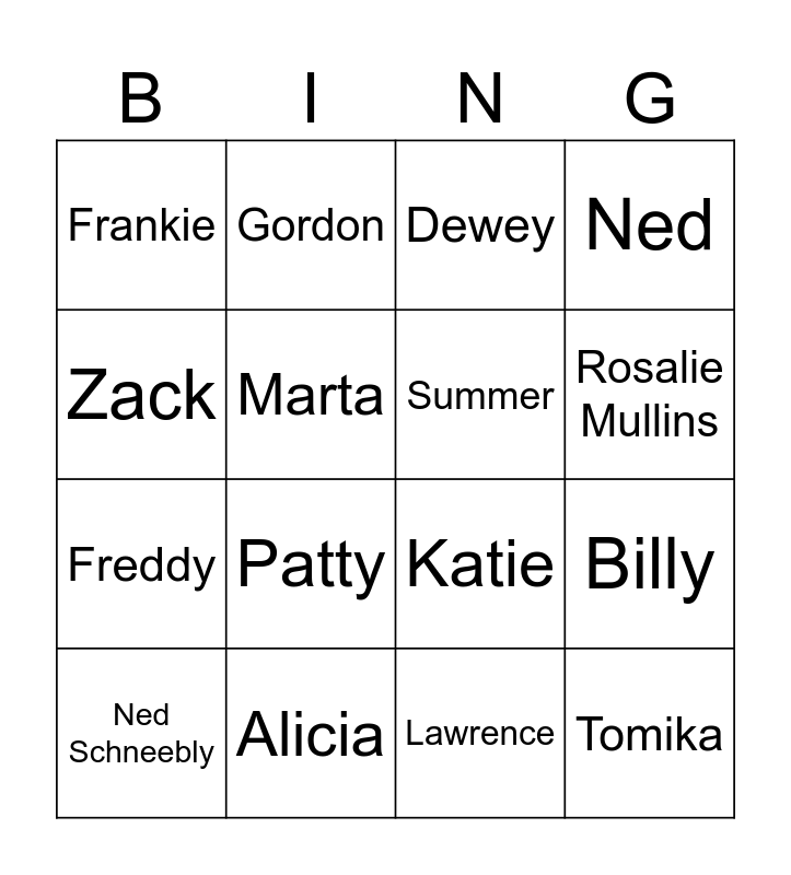 This bingo card has 16 words: Alicia, Billy, Dewey, Frankie, Freddy, Gordon, Katie, Lawrence, Zack, Marta, Ned Schneebly, Ned, Patty, Rosalie Mullins, Summer and Tomika.