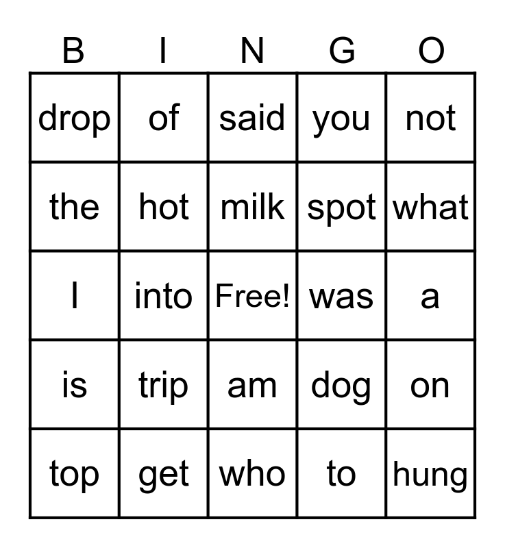This bingo card has a free space and 24 words: trip, get, milk, top, not, drop, the, of, was, am, spot, I, dog, on, hot, to, a, said, what, into, hung, is, you and who.