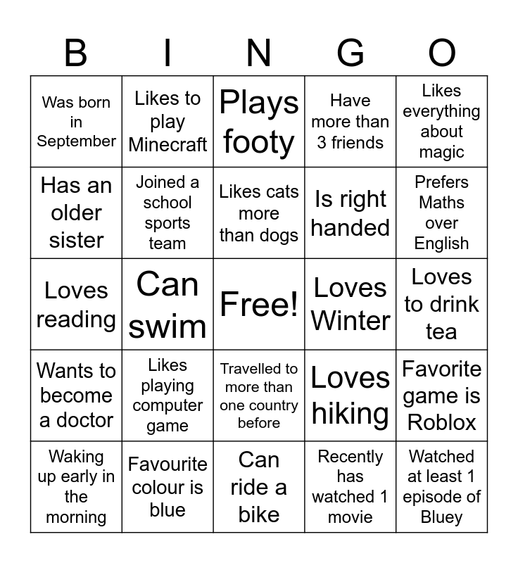 This bingo card has a free space and 24 words: Likes playing computer game, Favourite colour is blue, Likes cats more than dogs, Waking up early in the morning, Likes everything about magic, Was born in September, Has an older sister, Likes to play Minecraft, Loves Winter, Travelled to more than one country before, Is right handed, Loves reading, Loves hiking, Favorite game is Roblox, Joined a school sports team, Recently has watched 1 movie, Loves to drink tea, Plays footy, Prefers Maths over English, Can swim, Watched at least 1 episode of Bluey, Wants to become a doctor, Have more than 3 friends and Can ride a bike.