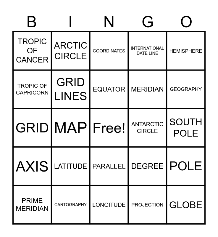 This bingo card has a free space and 25 words: LATITUDE, LONGITUDE, EQUATOR, PRIME MERIDIAN, HEMISPHERE, TROPIC OF CANCER, TROPIC OF CAPRICORN, ARCTIC CIRCLE, ANTARCTIC CIRCLE, PARALLEL, MERIDIAN, GRID, DEGREE, POLE, GRID LINES, NORTH POLE, SOUTH POLE, COORDINATES, GEOGRAPHY, MAP, GLOBE, CARTOGRAPHY, AXIS, INTERNATIONAL DATE LINE and PROJECTION.